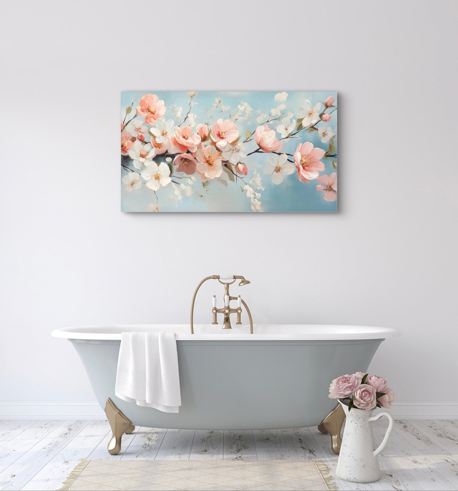 Zachte bloesemkunst in pastelroze en blauw, elegant werk voor een romantische of klassieke badkamer.