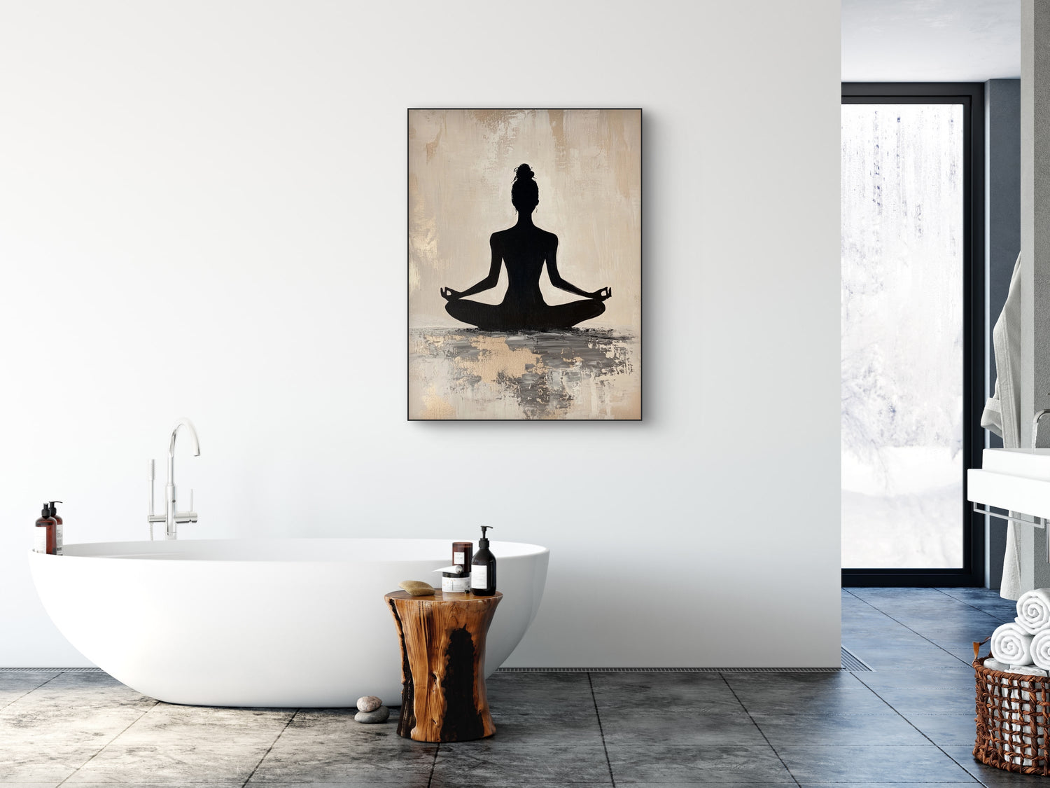 Minimalistische meditatiekunst in zwart-beige, ideaal voor een rustige, zen-achtige badkamer.
