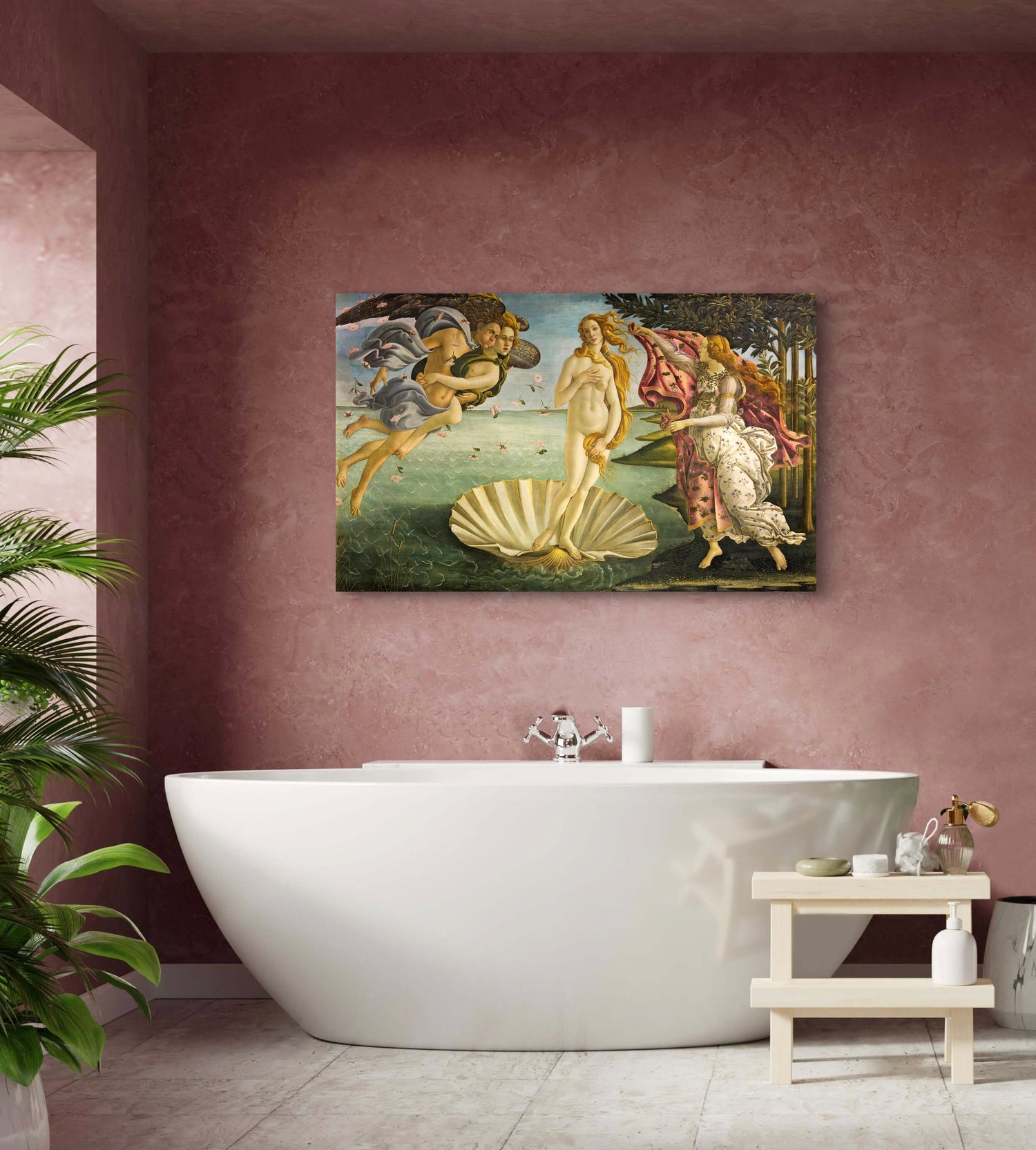 Klassieke kunst in luxe setting, Botticelli’s Venus als statement in een stijlvolle badkamer.
