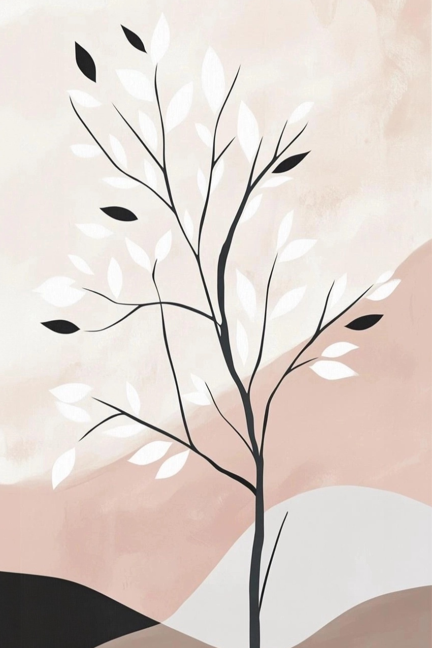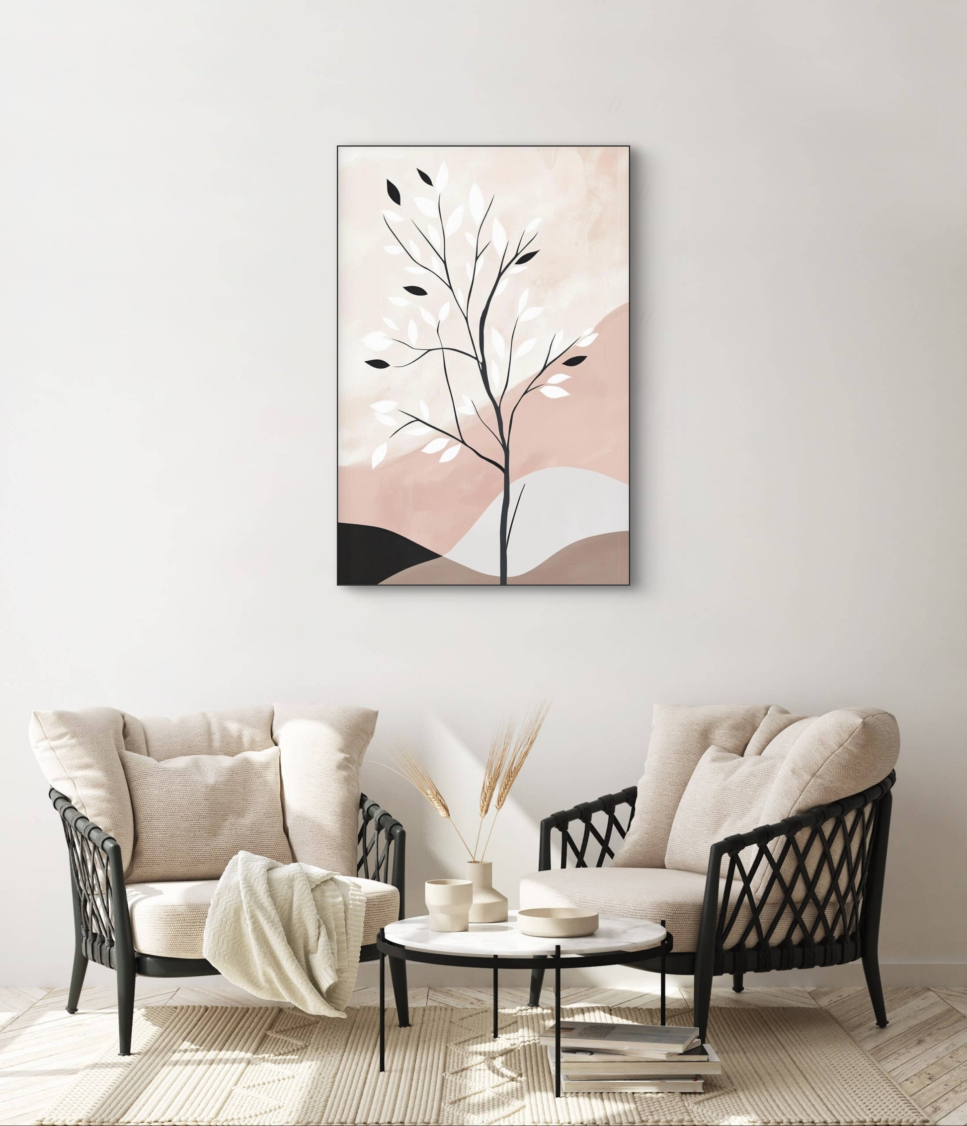 Een boom ontvouwt zich in verfijnde eenvoud, zijn bladeren zweven tussen zachte lijnen en pastel roze heuvels. De balans tussen wit en zwart, licht en vorm, maakt "Stilte in Bloei" een moderne ode aan rust, natuur en vormgeving.