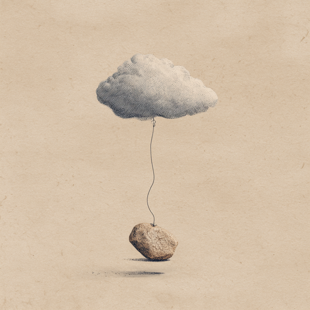 Tegenwicht vangt het subtiele evenwicht tussen lichtheid en zwaarte. Een wolk draagt een steen, als symbool van veerkracht en de kracht van het onmogelijke.
