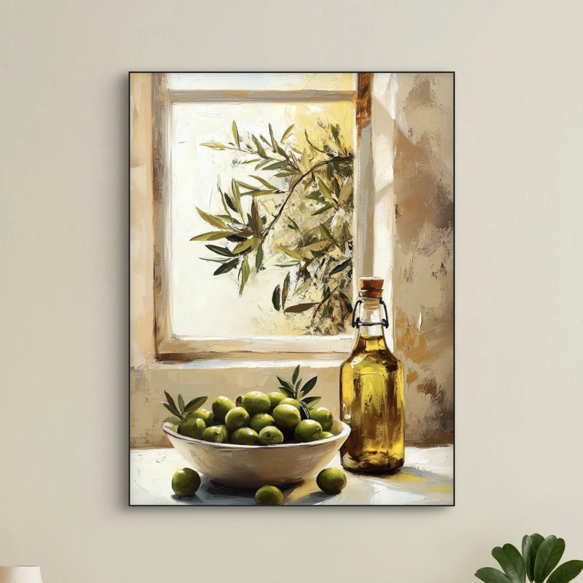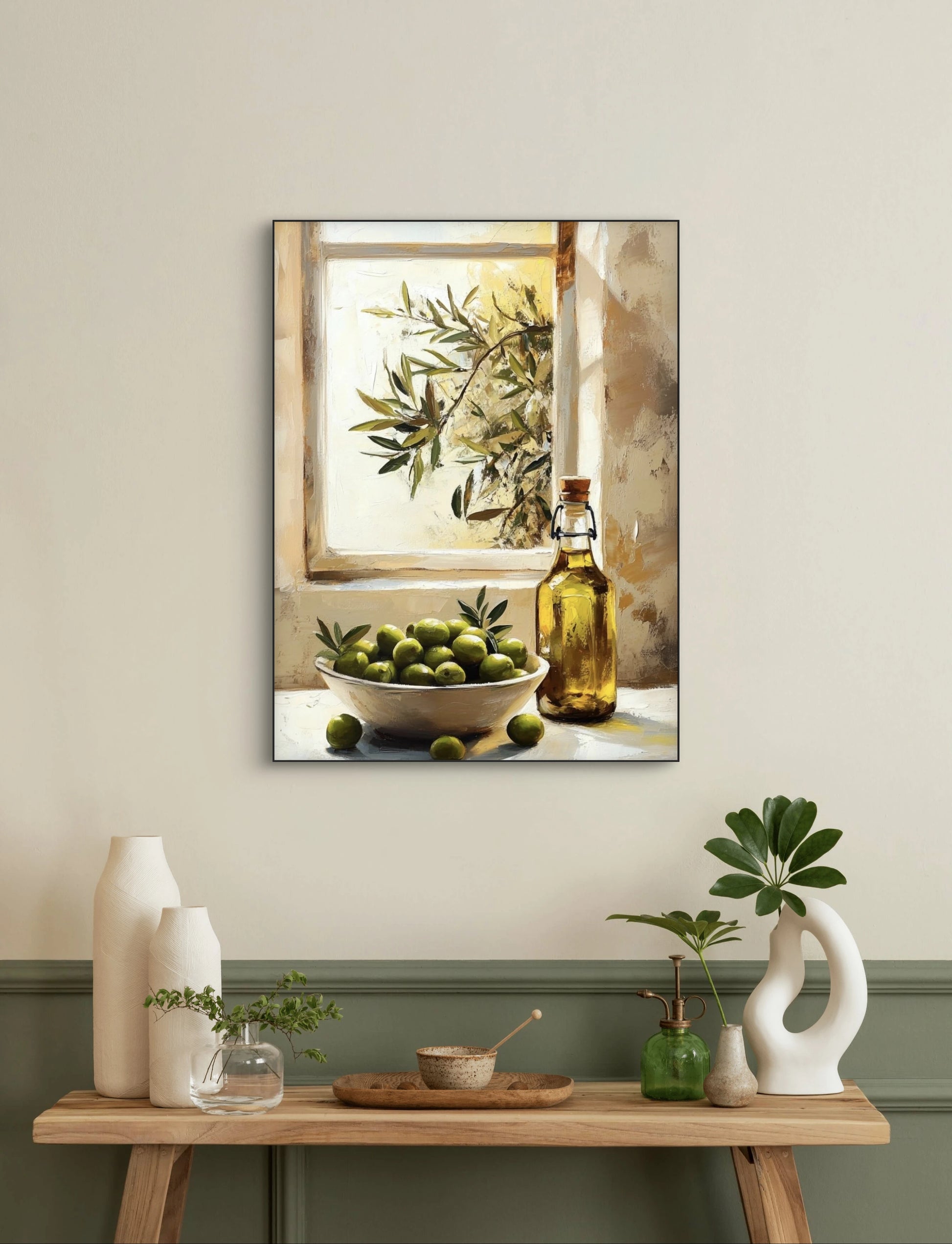 Een zonovergoten vensterbank, een schaal verse olijven, een flesje goudgeel olijfolie. “Zonlicht & Olijven” vangt dat ene zuidelijke moment van eenvoud en overvloed. Mediterrane warmte in verf gevangen.